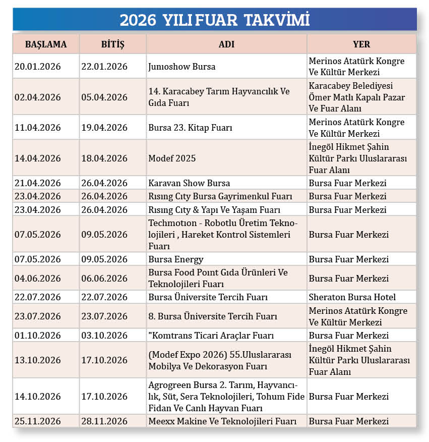 Son yıllarda fuarcılık alanında atılan adımlarla dikkat çeken Bursa, 2026 takvimiyle bu alandaki iddiasını sürdürmeyi hedefliyor. Fuarların, kentin sanayi kimliğini pekiştirmesi ve Bursa’yı bölgesel bir fuar merkezi haline getirmesi amaçlanıyor. Yetkililer, 2026 yılında düzenlenecek fuarların, Bursa’nın üretim, ihracat ve ticaret potansiyelini daha görünür kılacağını ve kentin ekonomik dinamizmine önemli katkı sağlayacağını ifade ediyor.