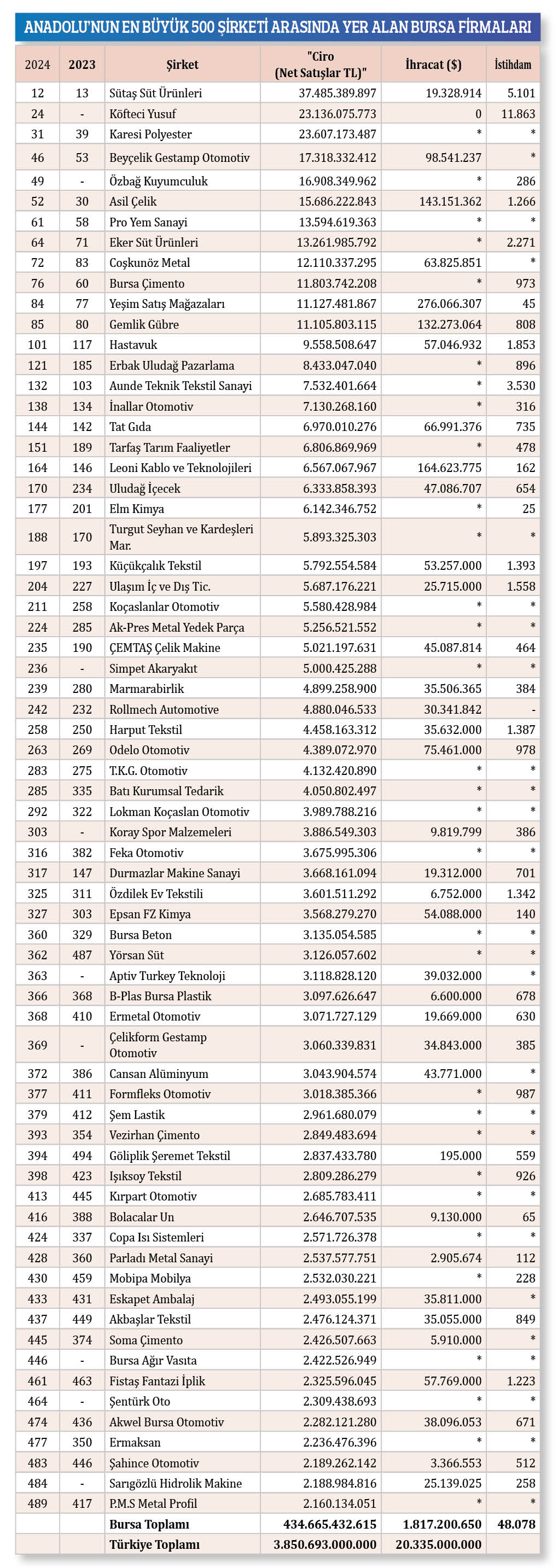 "Anadolu'nun En Büyük 500 Şirketi" listesinde 68 firma ile yer alan Bursa en çok şirket gönderen şehir olmaya devam ediyor. 2024 yılı verilerine göre Bursa firmaları 433 milyar 140 milyon 188 bin 372 TL cirodan net satışlar yaparken 1 milyar 817 milyon 200 bin 650 dolarlık ihracata imza attılar.