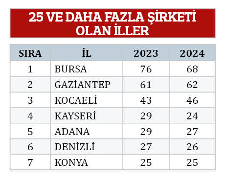 Kayseri, 2023 yılında 29 firmayla listede yer alırken 2024’te 24 firmaya gerileyerek 25 barajının altına düştü. Adana ve Denizli ise 25 ve üzeri firma sokabilen iller arasında kalmaya devam etti.