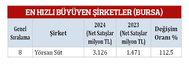 Anadolu 500 araştırmasında en dikkat çeken kategori olan “En hızlı büyüyen şirketler” listesinin ilk 10 sırasında Bursa geçtiğimiz yıl 4 firma ile ön plana çıkmıştı. Bu sene söz konusu kategoride Bursa, 1 firma ile kendisine yer buldu. Yörsan Süt 3 milyar 126 milyon TL ile 8’inci sırada yer aldı.