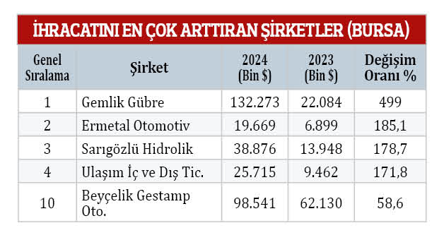 “İhracatını en çok artıran şirketler” kategorisinde ise 132 milyon 273 bin dolar ile Gemlik Gübre birinci, 19 milyon 669 bin dolar ile Ermetal Otomotiv ikinci, 25 milyon 715 bin dolarla Ulaşım İç ve Dış Ticaret 4’üncü ve 98 milyon 541 bin dolarla Beyçelik Gestamp Otomotiv 10’uncu sırada kendilerine yer buldu.