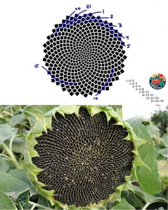 Ayçiçeğinin merkezinde, tohumlar iki yönde dönen spiraller halinde düzenlenmiştir. Saydığınızda; genellikle 21 ve 34 ya da 34 ve 55 gibi sayılar görürsünüz. 🌻
