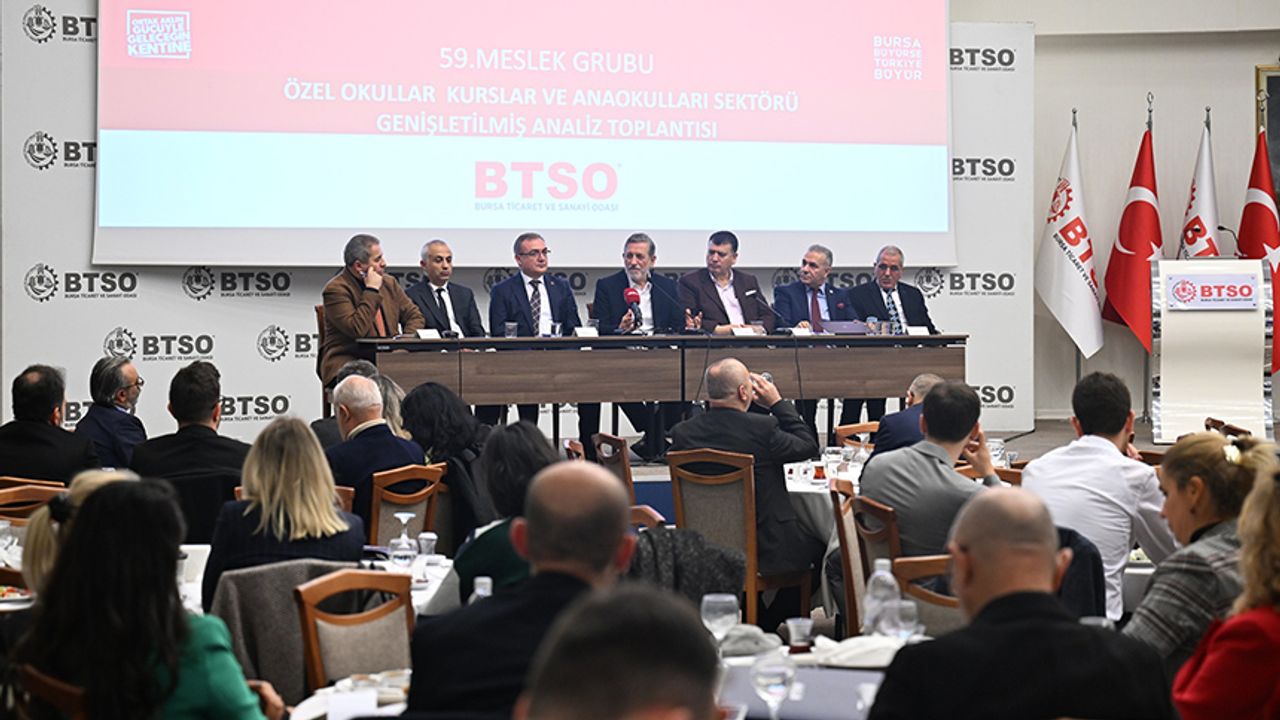 Bursa Ticaret ve Sanayi Odası (BTSO) 59. Meslek Komitesi Genişletilmiş Sektörel Analiz Toplantısı BTSO Ana Hizmet Binası’nda gerçekleştirildi. Toplantıya BTSO Yönetim Kurulu Başkanı İbrahim Burkay, Eğitim Konseyi Başkanı Gıyasettin Bingöl, Meclis Üyesi Orhan Adanur, Komite Başkanı Hasan Temelli, Komite Üyesi İsmail Güler ile özel okullar, kurslar ve anaokulları sektörü temsilcileri katıldı. Sektörel talepler ve beklentilerin değerlendirildiği toplantıda ayrıca Çalışma ve Sosyal Güvenlik Bakanlığı Bursa Rehberlik ve Teftiş Grup Başkanı Gökhan Kuzu ve Bakanlık Baş İş Müfettişi Volkan Avcı eğitim sektöründe teftiş süreçlerine ilişkin sektör temsilcilerinin sorularını yanıtladı.