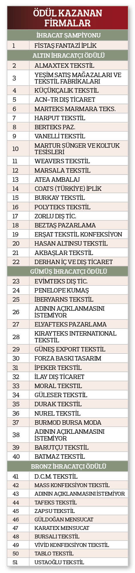 2025 yılında tekstil ihracatına yön veren ve İpek Böceği Ödülleri’nde zirveyi göğüsleyen ilk 10 firma, sektörün üretim ve pazarlama gücünü bir kez daha kanıtladı. Listenin başında yer alan Fistaş Fantazi İplik'i sırasıyla; Almaxtex Tekstil, Yeşim Satış Mağazaları, Küçükçalık Tekstil ve ACN-TR Dış Ticaret takip etti. İhracatın zirvesindeki diğer isimler ise Marteks Marmara Tekstil, Harput Tekstil, Berteks Pazarlama, Vanelli Tekstil ve Martur Sünger ve Koltuk Tesisleri oldu. Bu dev kuruluşlar, sağladıkları döviz girdisiyle tekstil sektörünün sürdürülebilir büyümesindeki lokomotif rollerini bir kez daha tescillediler.